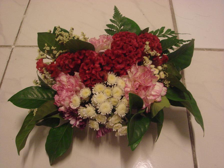 赤いモコモコの花をメインに、高さを低めに揃えて彩り良く、グリーンを効かせてとてもかわいらしく仕上がって満足です。