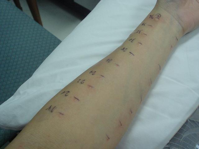 腕に32種類の薬剤をつけていき、その薬剤付けた箇所に針でプチっと傷を付けて反応を見ます。