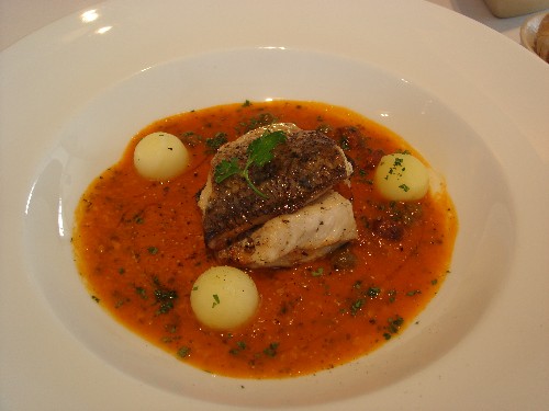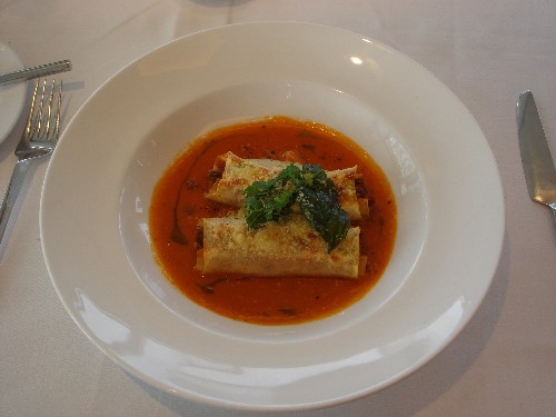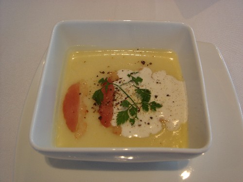 私は前菜に「スモークサーモンとポテトスープ」、メインを「魚のフェタチーズ入りトマトソース」