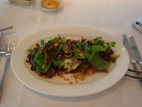 友達は「ベビーオクトパスのサラダ」、「牛肉をパスタで巻いたやつのトマトソース」(名前忘れたー)