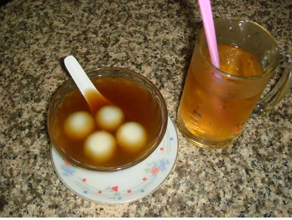 バンコクの中華系の店のゴマ団子はしょうが汁にゴマあん入り白玉が浮かんでいるもので
