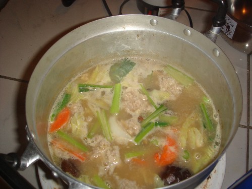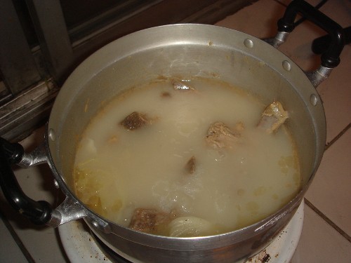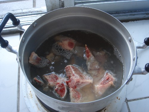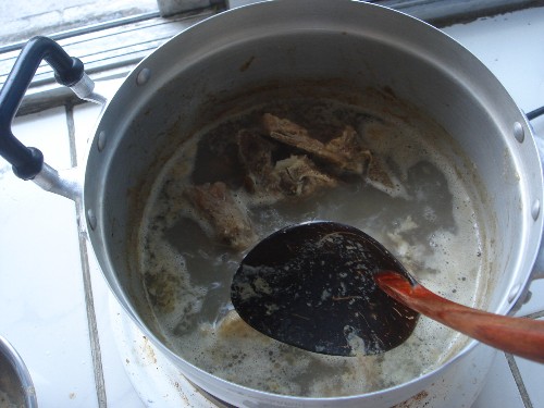 4.弱火で3時間以上煮る。その間に灰汁を取り、あまりにも水位が下がるとまたお湯を足す。