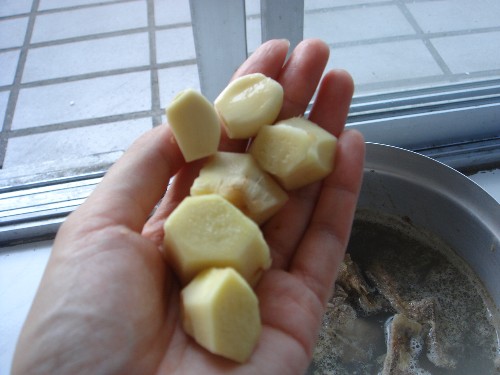 3.灰汁を取り、お湯を足してしょうが、にんにく、くず野菜(今回はキャベツ1/6)を入れる。